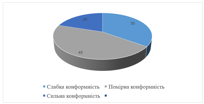 Аналіз відповідей жінок похилого віку щодо навіюваності показав, що слабка конформність зустрічається у 35% опитаних, помірна – у 45%, сильна – у 20% опитаних. Результати аналізу відповідей жінок похилого віку щодо навіюваності свідчать про важливі відмінності в рівнях конформності серед учасниць дослідження (рис. 2.1).