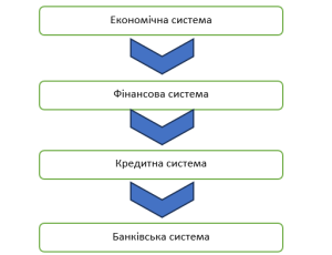 Банківська система є складовою кредитної системи, яка, у свою чергу, є частиною фінансової системи країни, а фінансова система є складовою економічної системи країни (див. рис. 1.1) [11;12].