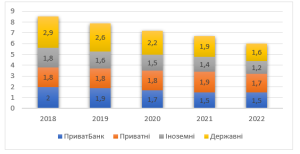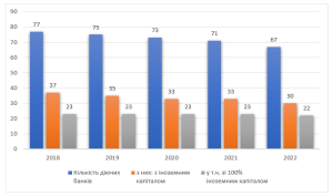 Стан банківської системи має вплив на економіку країни через виконання функцій фінансового посередника та інвестиційної установи. Останні політичні та економічні кризи, що вразили Україну, призвели до негативного впливу на показники банківської системи країни. За останні п’ять років (від 2018 до 2022 року) в Україні спостерігається поступове зменшення кількості банків (див. рис. 2.1).