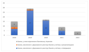 Рис. 2.2 – Кількість виключених банків та банків, у яких відкликано банківську ліцензію в Україні в період 2018–2022 рр., од.