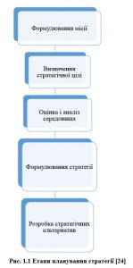 Стратегія являє собою детальний комплексний комплексний план, призначений для того, щоб забезпечити здійснення місії організації та досягнення її цілей. Процес стратегічного планування, як правило, включає кілька етапів. Місія організації – основна загальна мета організації, чітко виражена причина її існування. Це те, в чому полягає діяльність компанії, і чим вона має намір займатися, тобто. результат позиціонування компанії серед інших учасників ринку [25]. Правильно сформульована місія дозволяє обґрунтовано побудувати дерево цілей бізнесу, сформувати стратегію розвитку, визначити основні функції, процеси, зміст посадових інструкцій тощо. Значення відповідної місії, яка формально виражена та ефективно представлена співробітникам організації, що неможливо перебільшити. Якщо керівники не знають, яка основна мета їх організації, то у них не буде логічної точки відліку для вибору найкращої альтернативи. Етапи планування стратегії подано на рисунку нижче ( рис. 1.1).