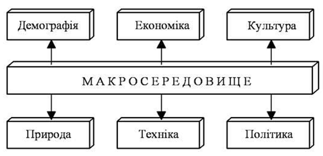 Згідно з П. Петриченком, зовнішнє середовище складається з шести основних чинників: демографічних, економічних, природних, науково-технічних, політичних та культурних факторів [5, c. 367].