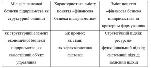 Фінансова безпека підприємства – це одна з найбільш важливих складових економічної безпеки. Основна мета фінансової безпеки полягає в тому, щоб забезпечувати максимально ефективне та стабільне функціонування будь-якого підприємства. Таке забезпечення має відбуватися не тільки на сьогоднішній день, але й також має забезпечувати високі можливості, високий потенціал в майбутньому. Якщо розглядати фінансову безпеку, то варто згадати, що на сьогоднішній день існує декілька підходів, що допомагають охарактеризувати фінансову безпеку підприємства. Фінансова безпека підприємства є основним елементом ефективної діяльності підприємства і також є передумовою створення прогнозу потенційних проблем, а також допомагає забезпечувати, запобігати, або й також протидіяти загрозам, які можуть бути загрозами для ефективності функціонування системи фінансової безпеки на підприємстві (табл. 1.1).
