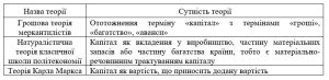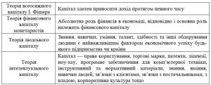 Із розвитком виробничої промисловості і товарно-грошових відносин поняття «капітал» набуло нового значення, а саме як сума грошей, наданих у позику і здатні приносити дохід у вигляді нарахованих відсотків. Таке трактування зберігалося до кінця ХІХ ст. Нижче в табл. 1.1 наведені теорії трактування капіталу різними групами вчених.