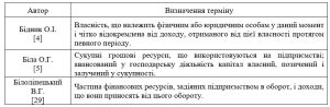 Свій внесок у трактуванні поняття капіталу зробив і український вчений М. Туган-Барановський. Він визначив капітал як будь-яка річ, що набуває властивості з часом зростати у вартості, таким чином даючи постійний дохід її власнику. Він також зазначив, що диспропорційність у розміщенні капіталу є основною причиною виникнення кризових ситуацій в економіці [27]. На сьогоднішній день різні вчені ототожнюють капітал по-своєму. Характеристика визначення цього поняття в сучасних літературних джерелах наведена в табл. 1.2.