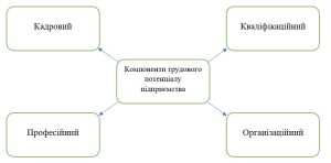 Зміст категорії «компоненти трудового потенціалу», якщо розглядати в цілому, включає професійні знання, практичні навички, особистісні та психофізіологічні характеристики працівників. Щоб визначити характер трудового потенціалу, спочатку необхідно визначити мету діагностики. На цій основі можна провести чітку діагностику трудового потенціалу, провести базову ситуаційну оцінку, оцінити трудовий потенціал окремих співробітників і команд, оцінити трудовий потенціал підприємств і провести перспективну оцінку трудового потенціалу ретроспективно [7, с. 152]. Розглядаючи компоненти трудового потенціалу підприємства, ми вважаємо, що можна виділити наступні складові: кадрову, професійну, кваліфікаційну, організаційну (рис. 1.1.).