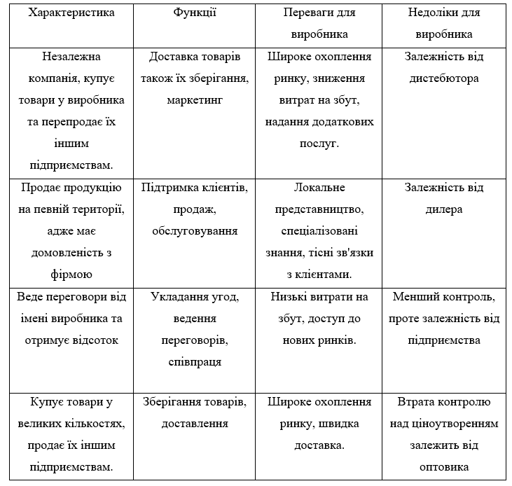 Аналізуючи таблицю 1.1 розбираємо що за типом посередника ми виділяємо таких посередників, як: дистибютор, дилер, агент, брокер, оптовий торговець та електронний торговий майданчик. Кожен з них має свою характеристику та функції. Також у цій таблиці ще було виділено переваги та недоліки до кожного типу посередника.