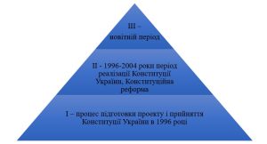 Після здобуття Україною незалежності, у ніч з 27 на 28 червня 1996 року Верховна Рада України ухвалив Конституцію – основний закон України. Вищий законодавчий акт. Конституція України визначає основні засади організації вищих органів державної влади та місцевого самоврядування, їх взаємини та повноваження, а також права, свободи та обов’язки громадян [13, с. 40]. Після прийняття Україною незалежності, у процесі конституційної реформи в Україні, доречно було б виділити три етапи становлення Конституції (рис. 1.1).