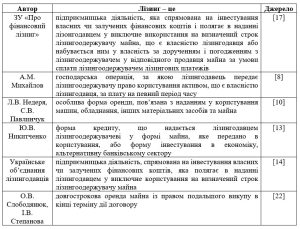 Лізинг як засіб залучення інвестицій знайшов своє застосування у розвинених країнах ще у XX столітті. Наприклад, у 1952 році в США була заснована компанія «United States Leasing Corporation», яка стала піонером у проведенні лізингових операцій. Тому, можна сказати, що США є батьківщиною лізингу. Україна почала використовувати лізинг як інструмент залучення інвестицій у 90-х роках. Урядовці розпочали використовувати лізинг з метою стимулювання інвестиційної діяльності в країні. З тих пір, лізинг став популярним в Україні та широко використовується в різних сферах господарювання [7]. Поняття «лізинг» має різні трактування, які включаються як у законодавстві, об’єднаннях підприємців, так і в працях науковців. В англійській мові «лізинг» походить від слова «to lease», що означає здавати (брати) в оренду. Узагальнення наукової літератури дозволило у табл. 1.1 навести основні наукові підходи щодо трактування цього поняття.