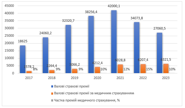 Рисунок 2.1 – Динаміка загальних валових премій та валових премій медичного страхування за 2017-2023 роки, млн. грн.
