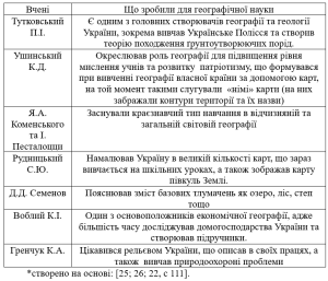 Географія є важливим предметом вивчення в сьогоденні, адже формує пізнавальну діяльність та кругосвіт кожного учня та людини. Проте географічна освіта пройшла певні етапи до того вигляду яка вже є зараз. Тому пропонуємо дослідити вчених, що внесли вклад в сучасну географічну науку, (табл 1.1). Таблиця 1.1. — Відомі вчені — географи та їх вклад в сучасну географічну науку