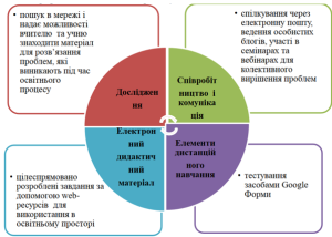 - участь у нових формах навчально-пізнавальної діяльності, пов’язаної як з пошуком у мережі іншомовної інформації, так і зі створенням та редагуванням власних текстів, фотографій, аудіозаписів, відеофрагментів тощо;