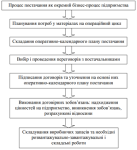 Оскільки процес поставки передбачає, що підприємство купує матеріали, необхідні для його роботи, під час здійснення цього процесу підприємством встановлює відносини з постачальниками товарно матеріальних цінностей і, після отримання необхідної цінності, розраховуються з ними. Крім придбання цінностей, у процесі господарської діяльності господарюючим суб’єктам також необхідно купувати різні види робіт і послуг, і тоді підприємства вступають у стосунки з підрядниками. Таким чином, основним підрядником підприємства при закупівлі предметів і засобів праці є постачальники, а при придбанні робіт і послуг – підрядники.