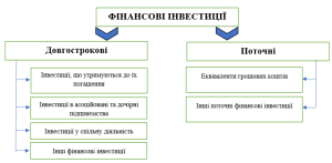 Фінансові інвестиції можна класифікувати як поточні, ящо період інвестування інвестицій не перевищує одного року, також такі інвестиції мають бути забезпечені можливістю їх легкої конвертації на ринку цінних паперів [1, с.23].