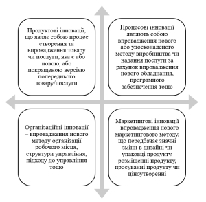 Інноваційну діяльність можна класифікувати по-різному, однак в основному її розподіляють на чотири основні види, що наведені на Рис. 1.1.