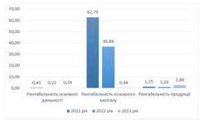 Сума фінансових ресурсів теж піддалася зростанню на 1020626 тис. грн. і в 2023 році склала 5895605 тис. грн. Капіталовіддача за аналізований період знизилась на 99,58% та у 2023 році склала 17,49 одиниць, капіталомісткість зросла та склала 0,06, капіталоозброєність зросла на 2224,13 одиниці і склала 2230,86. Рентабельність основної діяльності у 2022 році складала 0,22%, а у 2023 році зросла до 0,39%.Рентабельність продукції теж у 2023 році зросла на 1,84% та склала 2,86%. Рентабельність капіталу навпаки знизилося на 36,44% та склала у 2023 році – 0,44% (див. Рис. 2.3).