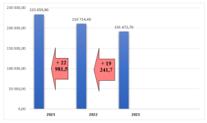 Після закінчення періоду виплат, Пенсійний фонд України здійснював повернення наданих позик в межах своїх фінансових можливостей. Залишок непогашених сум позик на початок 2023 року становив 11 885,1 млн. гривень [7].У 2022 році Пенсійний фонд України мав достатні фінансові ресурси для виплати пенсій та грошової допомоги 13,6 млн. пенсіонерам. Загальна сума витрат на пенсійні виплати склала 233 695,9 млн. гривень, що на 22 981,5 млн. гривень більше, ніж у 2021 році (рис. 2.3.).