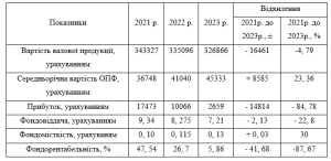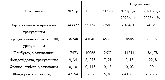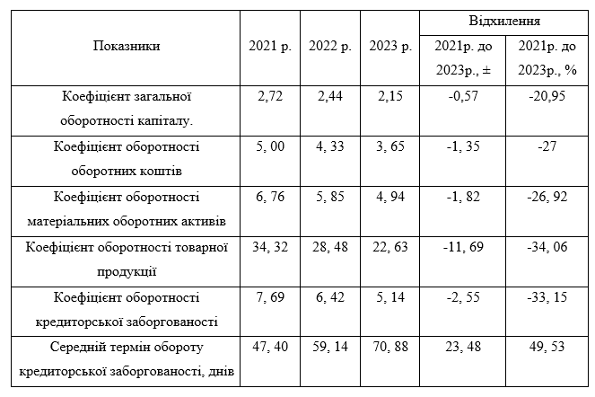 Аналізуючи дані таблиці 2.3, можна зробити висновок, що ресурси підприємства використовуються менш ефективно порівняно з 2021 та 2022 роками, що призводить до зростання потреби у оборотних коштах. Наприклад, коефіцієнт оборотності оборотних коштів зменшився на 27%, а термін обороту кредиторської заборгованості практично збільшився на 50%. З аналізу показників ефективності використання основних виробничих фондів видно, що спостерігається падіння їх використання на підприємстві. За два роки фондовіддача зменшилася на 22,8%, а рентабельність використання фондів знизилася на 87,67%.