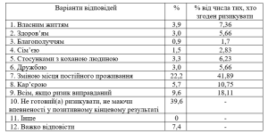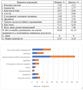 Аналіз таблиць розподілу даних дав можливість зробити такі узагальнення та висновки. Більше половини опитаних студентів (53%) виявили готовність ризикувати для досягнення поставленої мети. Інша частина респондентів (47%) виявила не готовність ризикувати, відчуваючи невпевненість у позитивності кінцевого результату. Проте, якщо говорити про області, в яких вони готові ризикувати, слід відзначити, що частина молодих людей, які готові ризикнути всім, становить 18,11% від тих, хто згоден ризикувати (9,6% від загальної кількості опитаних). Більшість тих, хто погоджується ризикнути, готові змінити своє місце проживання (41,89%).