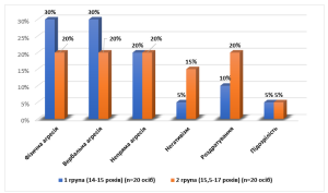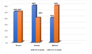За даними рис. 2.1. зрозуміло, що серед опитуваних по 50% підлітків віком 14-15 років та учнів підліткового віку від 15,5 до 17 років. Крім того, у першій групі було 60% хлопців та 40% дівчат, а в другій групі – навпаки – 40% хлопців та 60% дівчат.