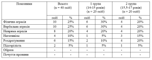 Аналізуючи прояви агресивної поведінки серед підлітків першої та другої групи, помічаємо більшу кількість учнів 1 групи із проявами фізичної та вербальної агресії, однакову кількість опитуваних з проявами непрямої агресії, переважання негативізму та роздратування серед учасників 2 групи.