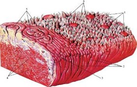 1 – грибоподібні сосочки; 2 – листоподібні сосочки; 3 – слизова оболонка; 4 – м’яз язика; 5 – жолобкуваті сосочки; 6 – ниткоподібні сосочки