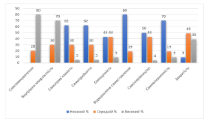 На етапі нашого дослідження ми оцінили рівень самоставлення підлітків за допомогою тесту-опитувальника самоставлення (В.В. Століна, С.Р. Пантелєєва). Метою цього тесту було встановлення емоційно-ціннісного компонента самоставлення. У процесі опитування ми використовували скорочену версію опитувальника, що складалася з 57 питань. Результати нашого дослідження представлені на рис. 2.1.
