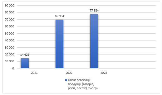 Рис. 2.1. Динаміка даних щодо обсягу реалізації продукції (товарів, робіт, послуг) «Grand Hotel Roxolana» за 2021-2023 роки
