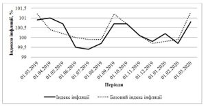 Індекс інфляції характеризує зміну загального рівня цін на товари та послуги за певний період часу. Ми можемо бачити це на рис. 1. Динаміка індексу інфляції протягом аналізованого періоду має нестійку тенденцію. Основними причинами динамічного зниження індексу з червня по серпень, грудень 2019 року і лютий 2020 року стали зниження цін на продовольство, збір плодоовочевої продукції, а також поліпшення інфраструктури зберігання і збуту. Висока динаміка цін на продукти харчування обумовлена окремим підвищенням цін на ці продукти.