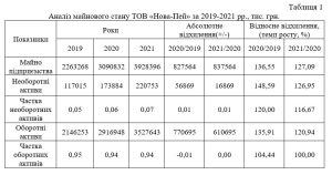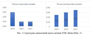 Проаналізувавши майновий стан ТОВ «Нова-Пей» за 2019-2021 рр., можемо сформулювати наступні висновки, що майно підприємства має стрімку динаміку до зростання. Необоротні активи мають більшу динаміку до зростання, ніж оборотні активи підприємства. Вартість необоротних активів за аналізований період зросла. На рис. 1 зображено структурно-динамічний аналіз активів ТОВ «Нова-Пей», що є візуальним підтвердженням.