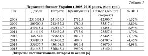 Прикладом може служити Україна, яка отримала кредити від МВФ в 2010 і 2014 роках з дефіцитом бюджету в розмірі 4-6% ВВП [3,8]. У цьому випадку існує небезпека довгострокових дефіцитів, і з кожним роком їх стає все важче долати. Слід особливо підкреслити, що економіка деяких країн світу не постраждала від довгострокових дефіцитів. Необхідно тільки забезпечити, щоб дефіцит не збільшувався і не призводив до краху економіки держави. Через дефіцит бюджету Україна довгий проміжок час відчуває постійний брак коштів. Розглянемо таблицю 1, в якій показана динаміка дефіциту бюджету України з 2008 по 2015 роки.